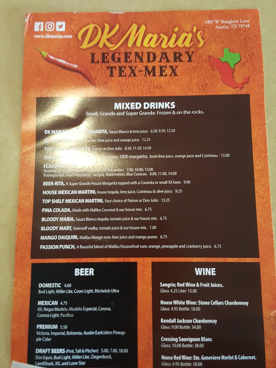 Welcome to DK Maria's Legendary Tex-Mex, a vibrant gem located at 1807 W Slaughter Ln, Austin. Known for its lively atmosphere and authentic flavors, this eatery invites you to embark on a culinary journey with its diverse menu.